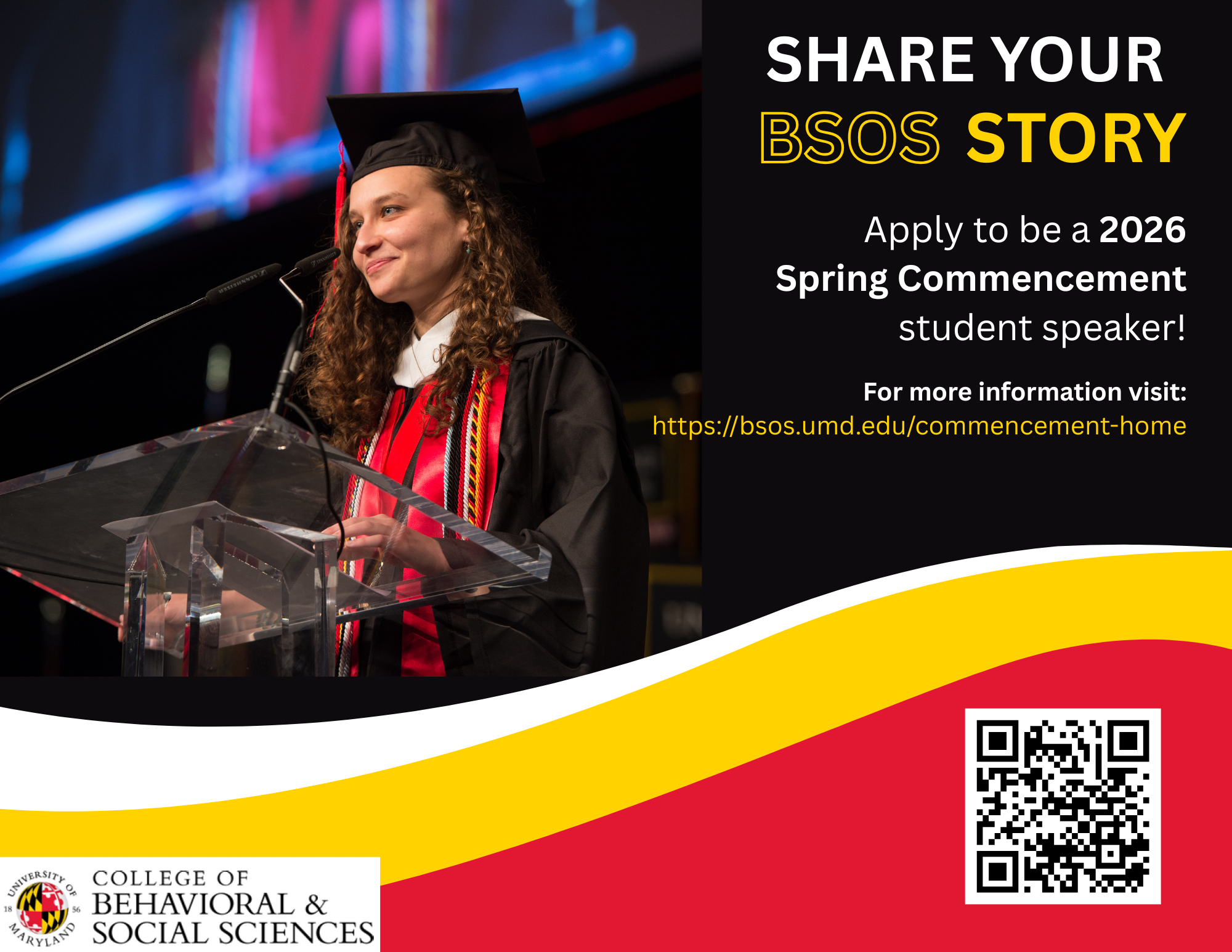 Every graduating class has a story to tell. Each year, one student is chosen for each BSOS commencement ceremony to represent their class as a Commencement Student Speaker. This student reflects on their college journey, celebrates shared achievements, and sends their classmates forward with a message of encouragement and hope. Could that be you?