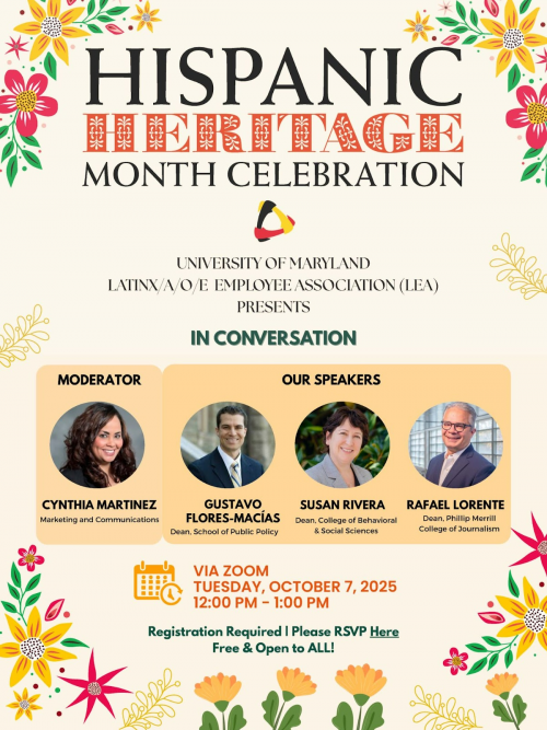 The UMD Latine/a/x/o Employee Association (LEA) invites the UMD community to a virtual celebration of Hispanic Heritage Month. Join us for an inspiring panel conversation, moderated by LEA member Cynthia Martinez, Senior Director, UMD Marketing and Communications. The event will feature three of our distinguished deans: