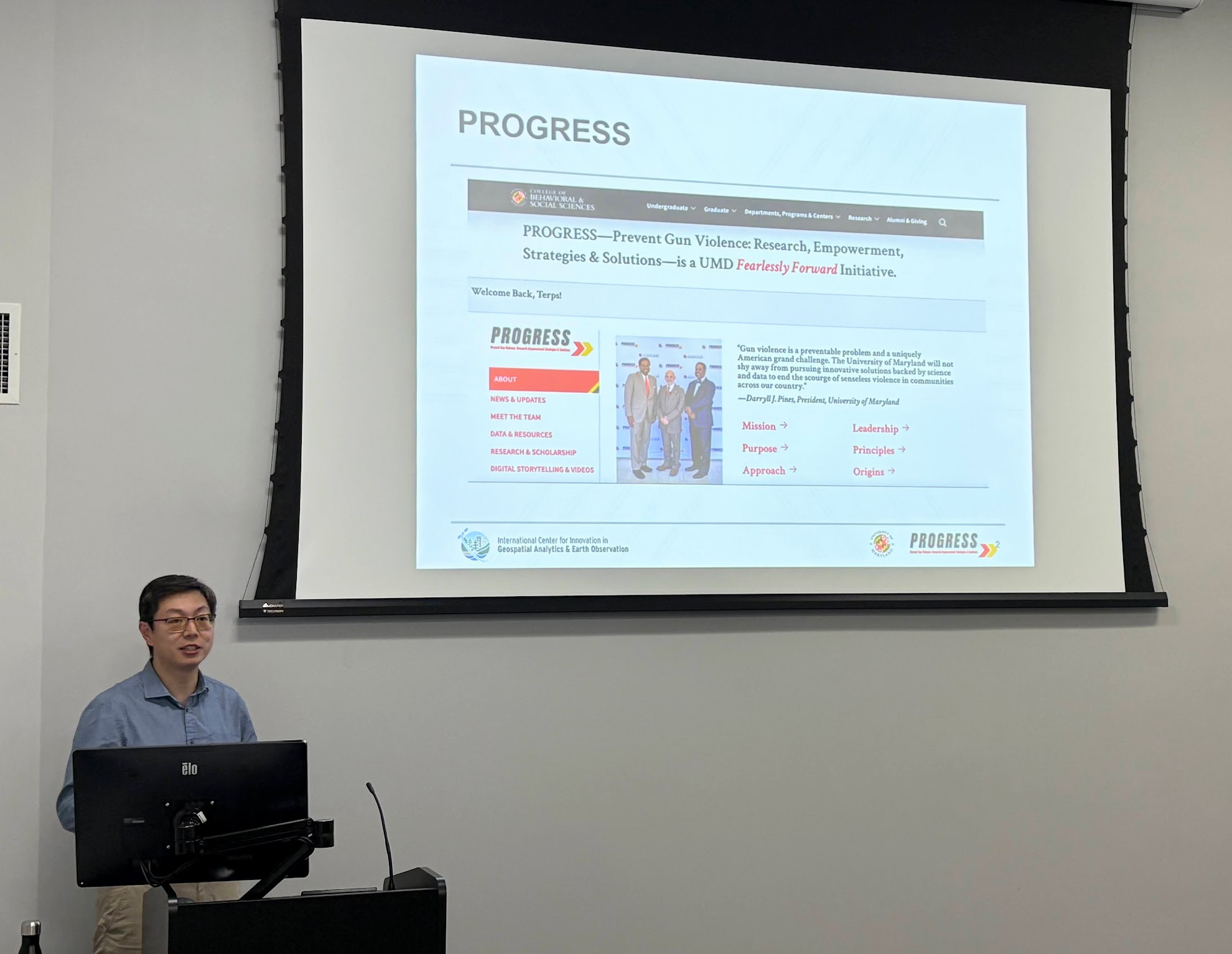During UMD’s GIS Day (November 19, 2025), Dr. Ruibo Han presented on a project that leverages GeoAI to advance gun violence prevention and reduction. As a PROGRESS Scholar and the Director of the Geospatial Intelligence (GEOINT) Programs at the Center for Geospatial Information Science, Ruibo Han’s research focus spans GeoAI, big data analytics, web and mobile GIS, and urban dynamics.